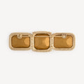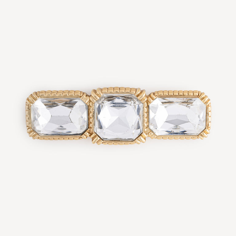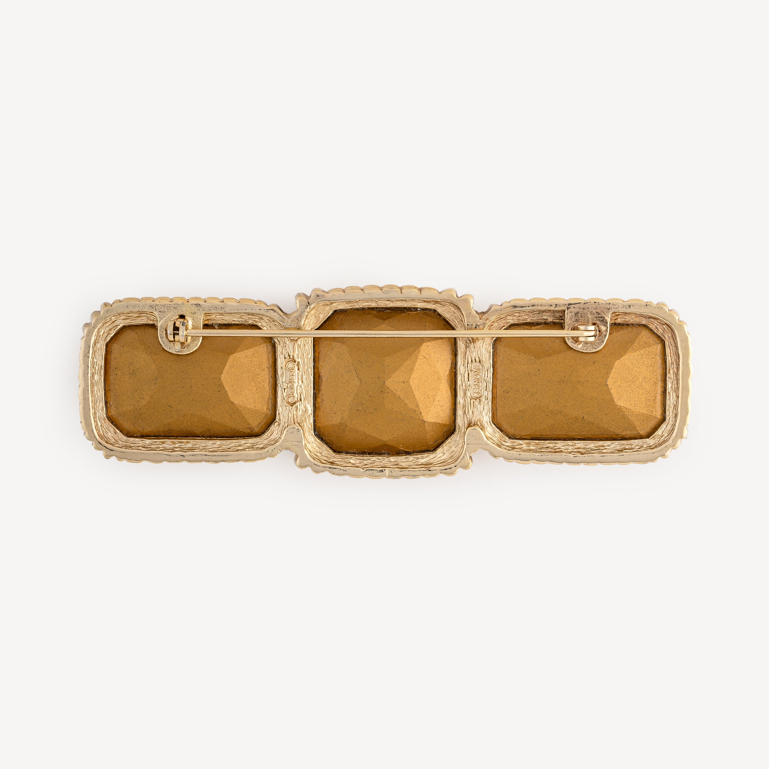Vintage brooch in gold-finish metal with three large clear crystals.