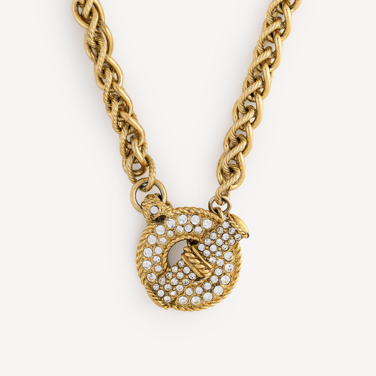 Vintage necklace in gold-finish metal with large T-shaped clasp adorned with clear crystals. Can also be worn as a belt.