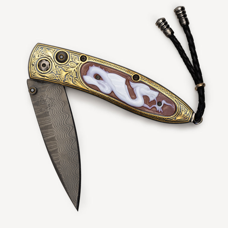 Pocket knife with black spinel, gold handle decorated with a white dragon.