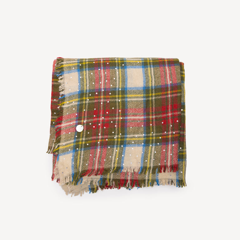 Checked scarf in shades of red, green, blue, yellow and white, handmade in cashmere adorned with Swarovski crystals.