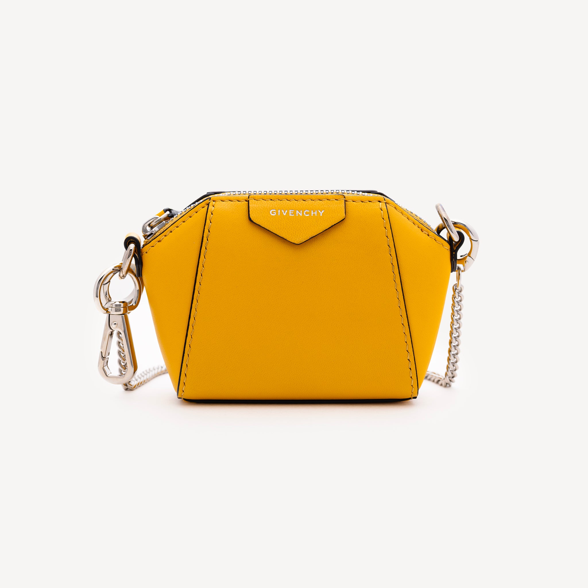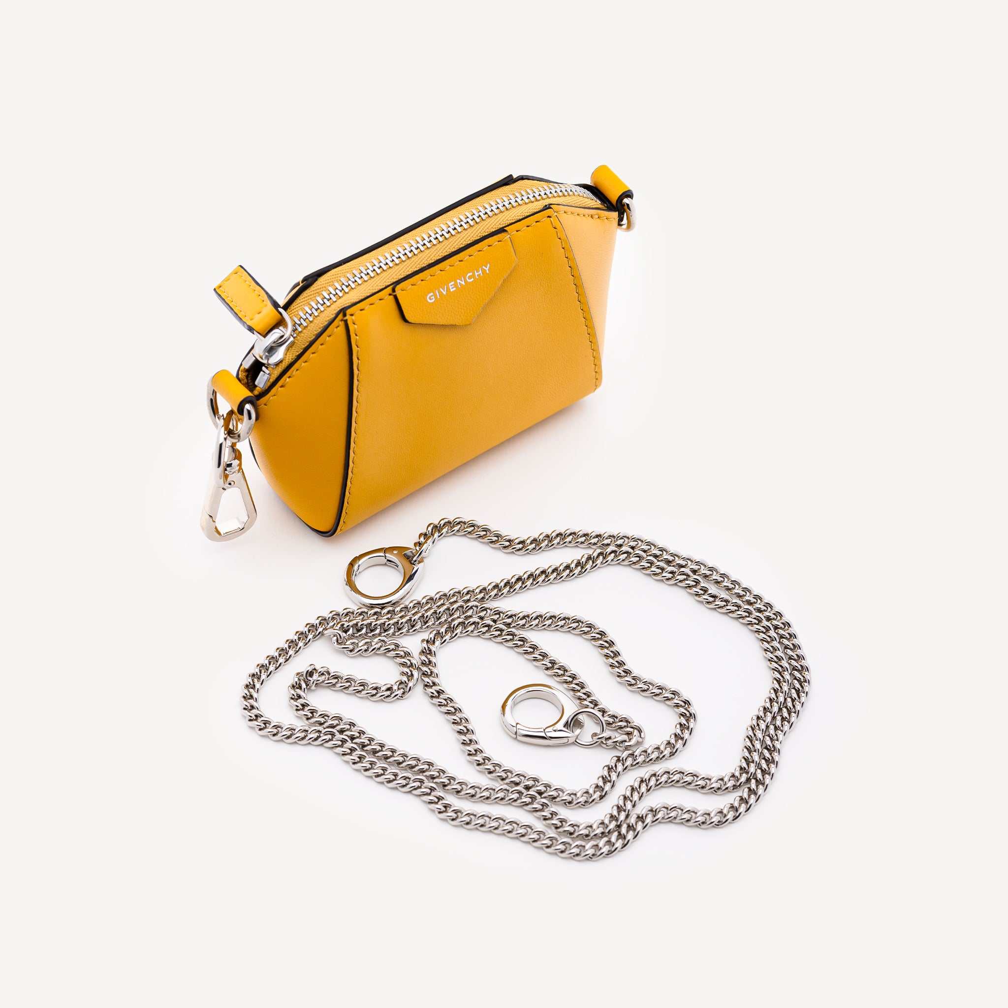 Mini sac jaune en cuir d’agneau. Bandoulière et fermeture éclair argentée. Vendu avec certificat d’authenticité d’origine, dans sa pochette et boite d’origine.