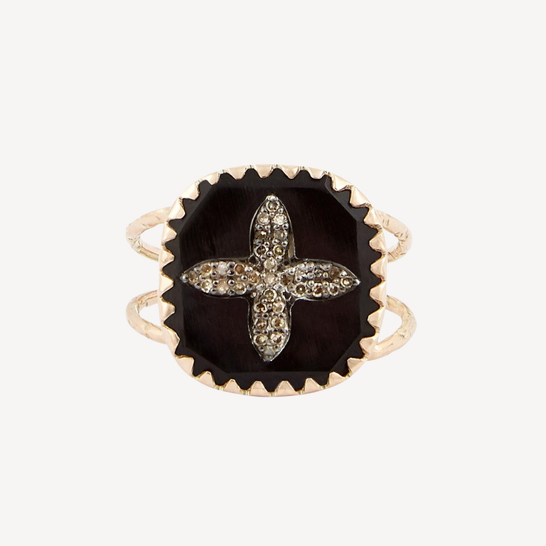 Ring in Rose Gold, black bakelite set with gold and inlaid diamonds.