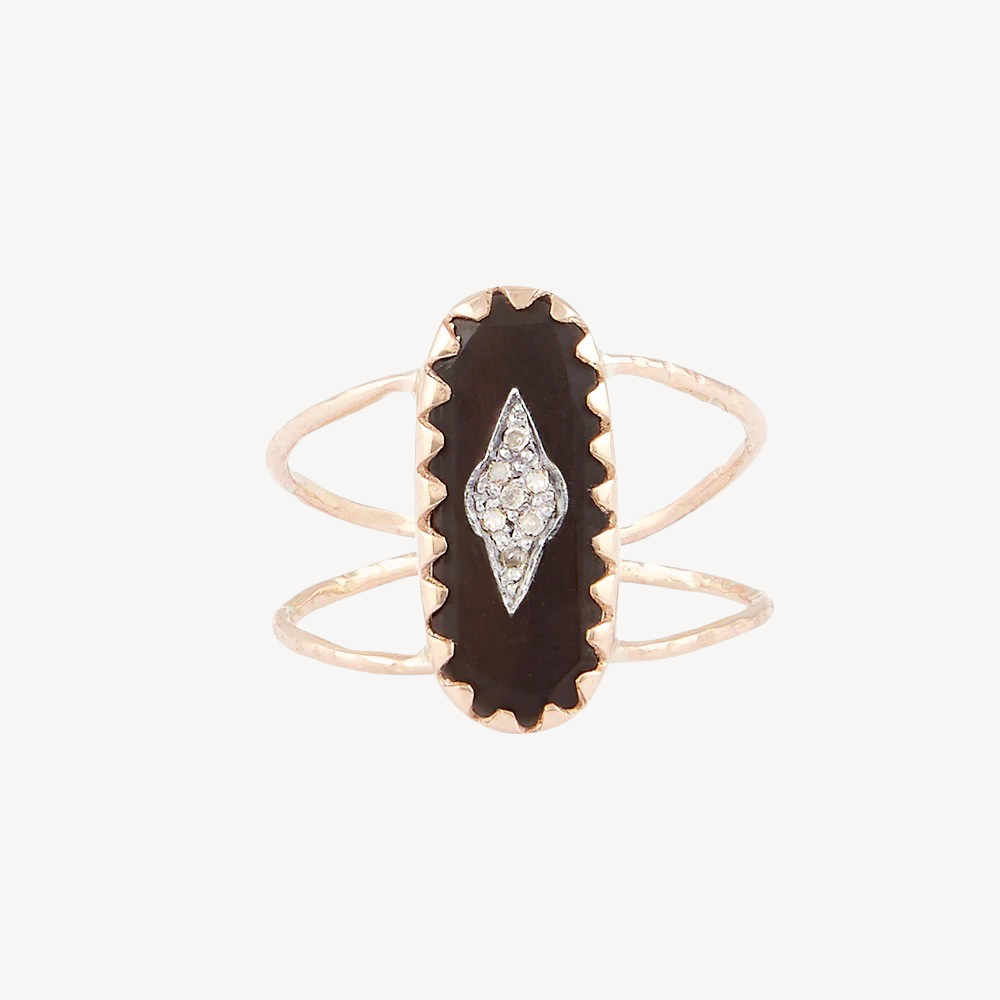 Ring in Rose Gold, black bakelite set in gold, inlaid with pavé diamonds.