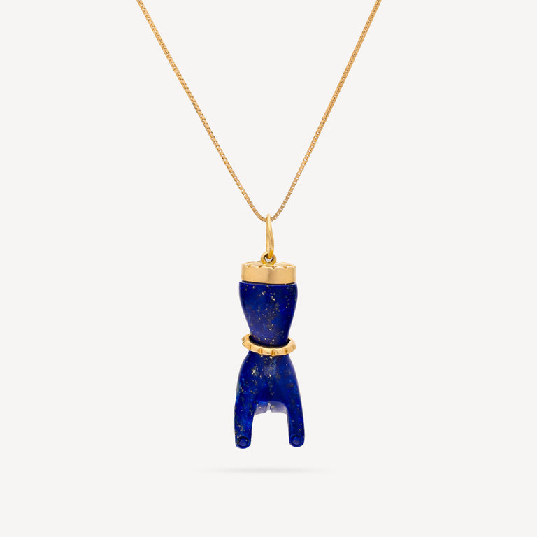This yellow gold necklace features a lapis lazuli pendant in the shape of a closed hand. Lapis lazuli soothes and regulates energy, contributing to a balance between body, mind and spirit.