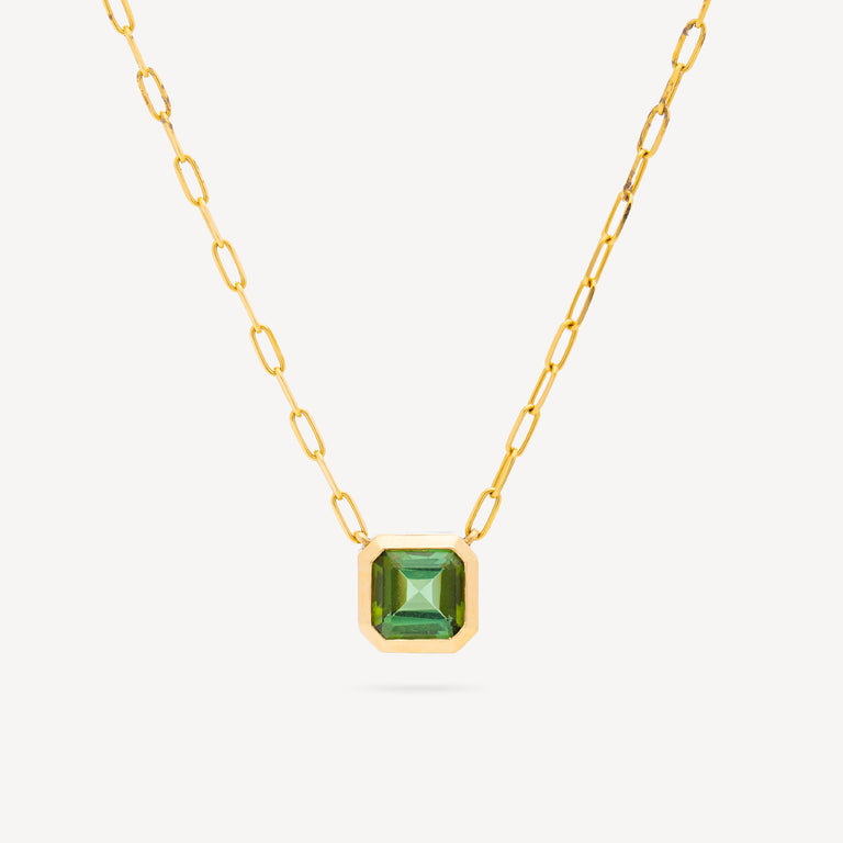 Combined with a geometric chain in 18-carat yellow gold, this necklace asserts its presence with subtlety yet assurance. The pendant features a tourmaline cut in Germany using the "german-cut" technique, the fruit of the expertise of exceptional lapidaries. A stone of transformation, tourmaline helps balance emotions, dispel negative energies and promote grounding.