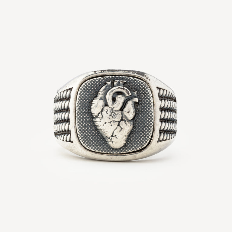 Silver signet ring with heart motif.