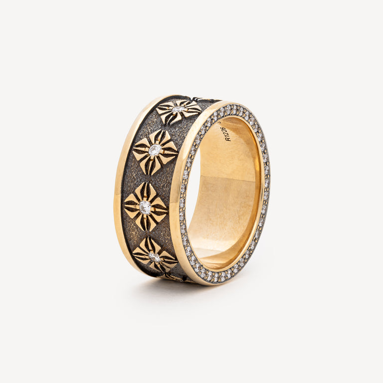 Sublime yellow gold ring adorned with the Shamballa logo and paved with white diamonds.