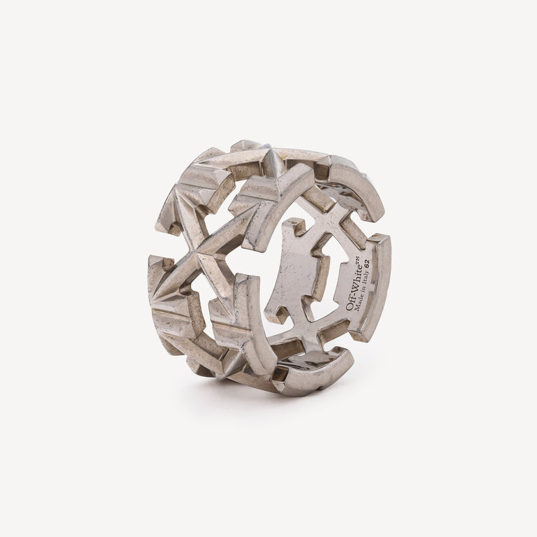 Copper ring featuring chain links and an arrow-shaped logo with a silver finish.
