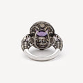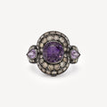 White gold ring set with pinkish-beige graded diamonds, two pink sapphires and a central amethyst.