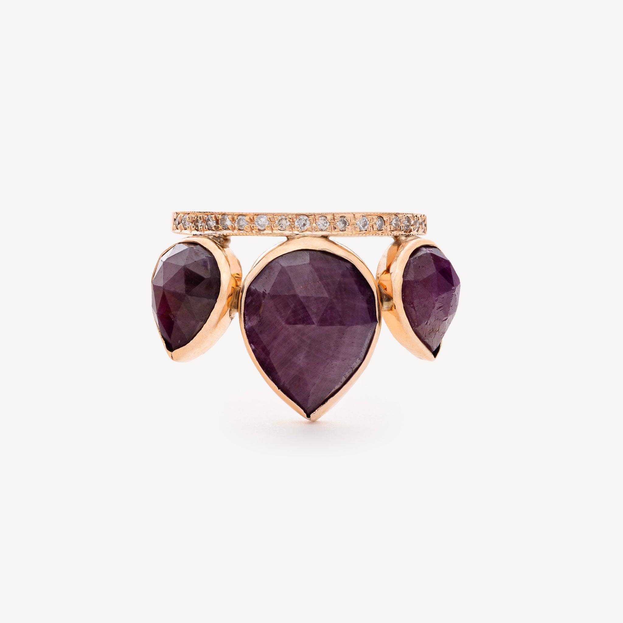 Petal ring in Rose Gold half paved with white diamonds and adorned with three rubies. Combined in a precious sparkle, the ruby symbolizes passion and vitality, while the diamonds bring strength, clarity and luminous energy to the wearer.