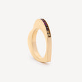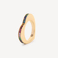 Heart-shaped yellow gold ring set with multicolored sapphires on top.