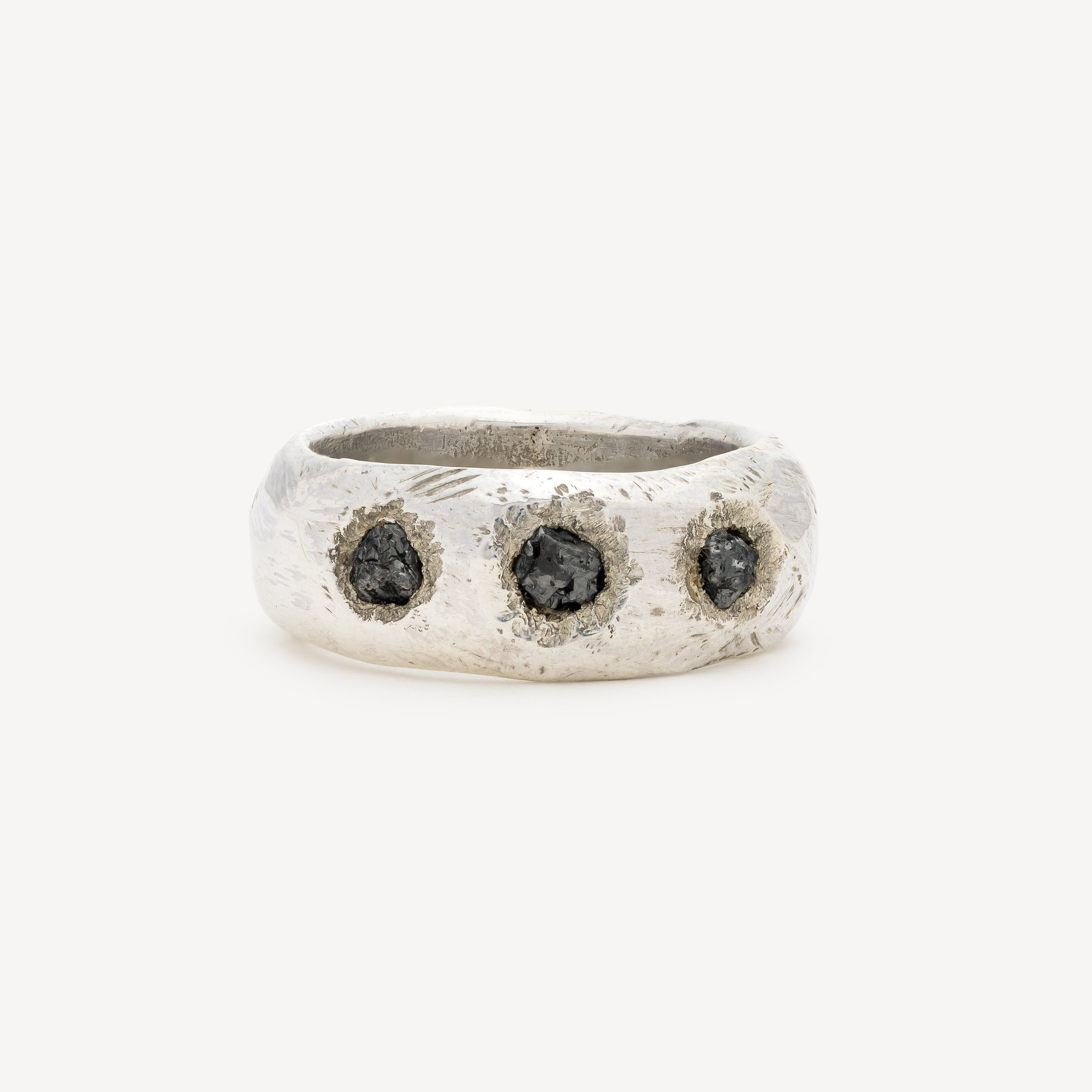 With its 3 black diamonds in the rough, this Silver ring will sparkle on your hand, day or night.