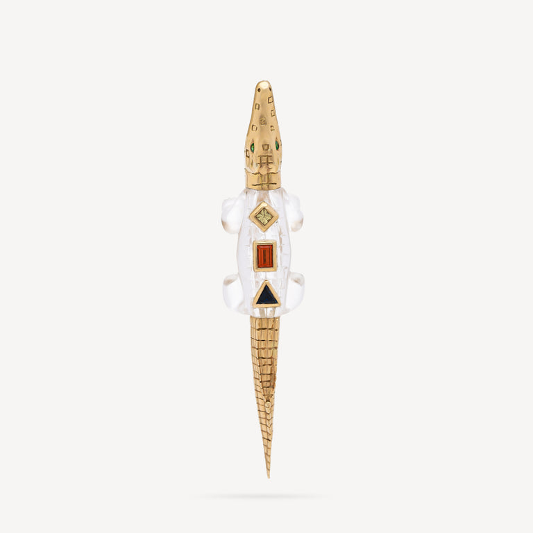 This alligator-shaped earring features white quartz and numerous sapphires.