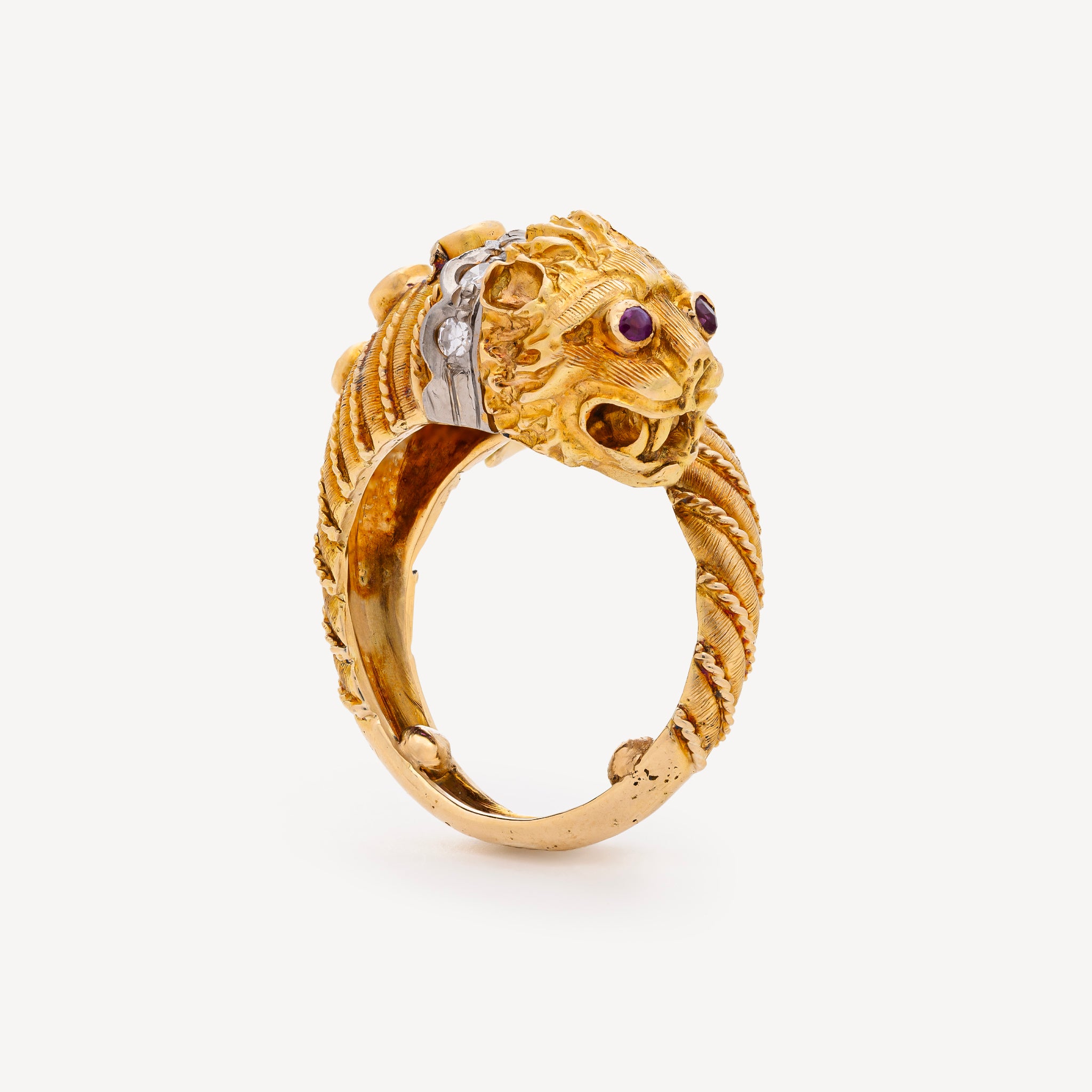 Magnificent ring dating from the 1980s. Made of yellow gold with 18ct white gold details, the ring is spiral-shaped and ends with a lion's head adorned with rubies and diamonds.