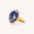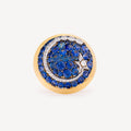 The Comet Kinetic ring is a radiant tribute to the beauty of the night sky. Handcrafted in 18-carat yellow gold, this fascinating piece features a bold dome of deep blue sapphires, illuminated by white diamonds. White diamonds protect against negative energies and develop strength and determination. A symbol of wisdom and truth, blue sapphires are renowned for calming the mind, stimulating mental clarity and promoting inner serenity.