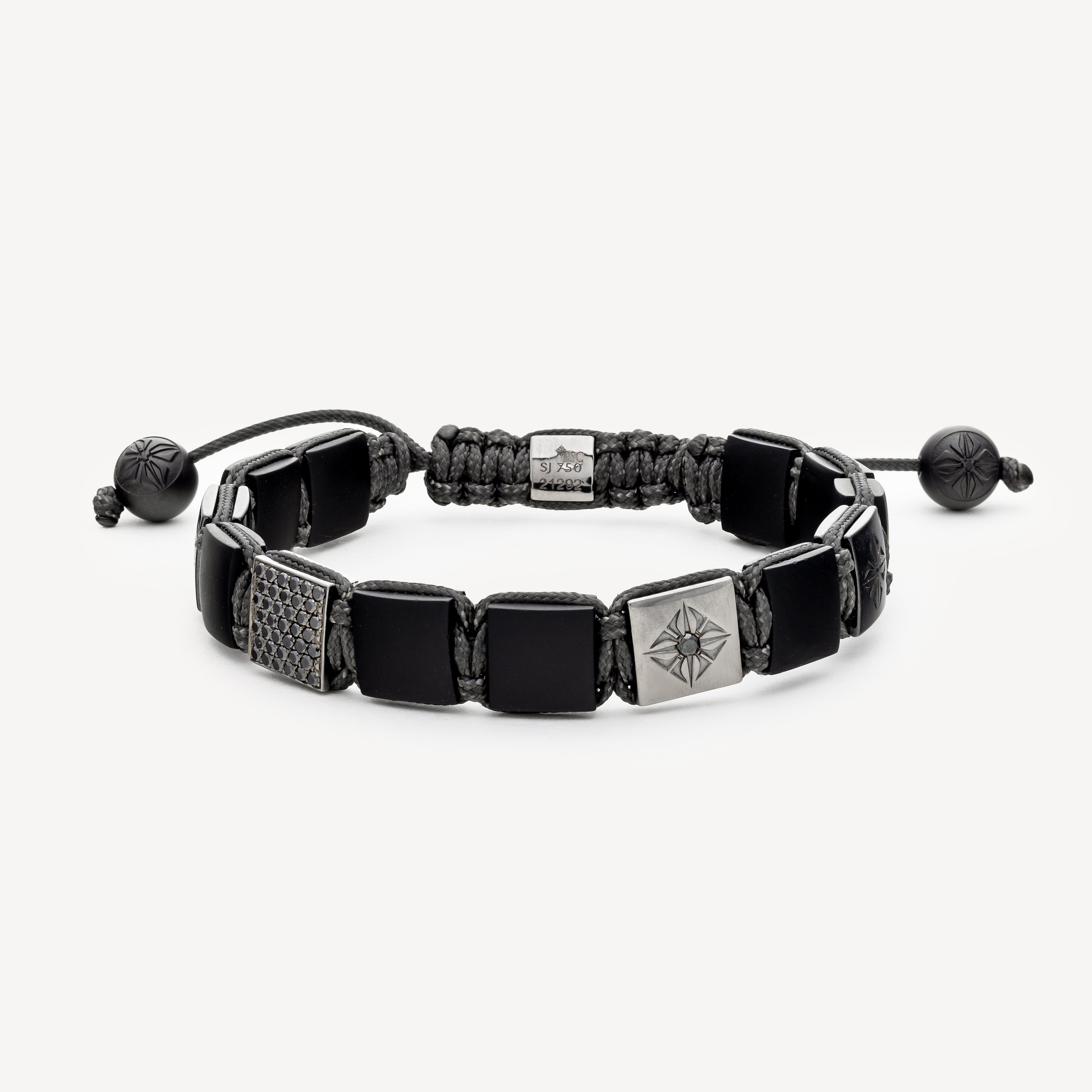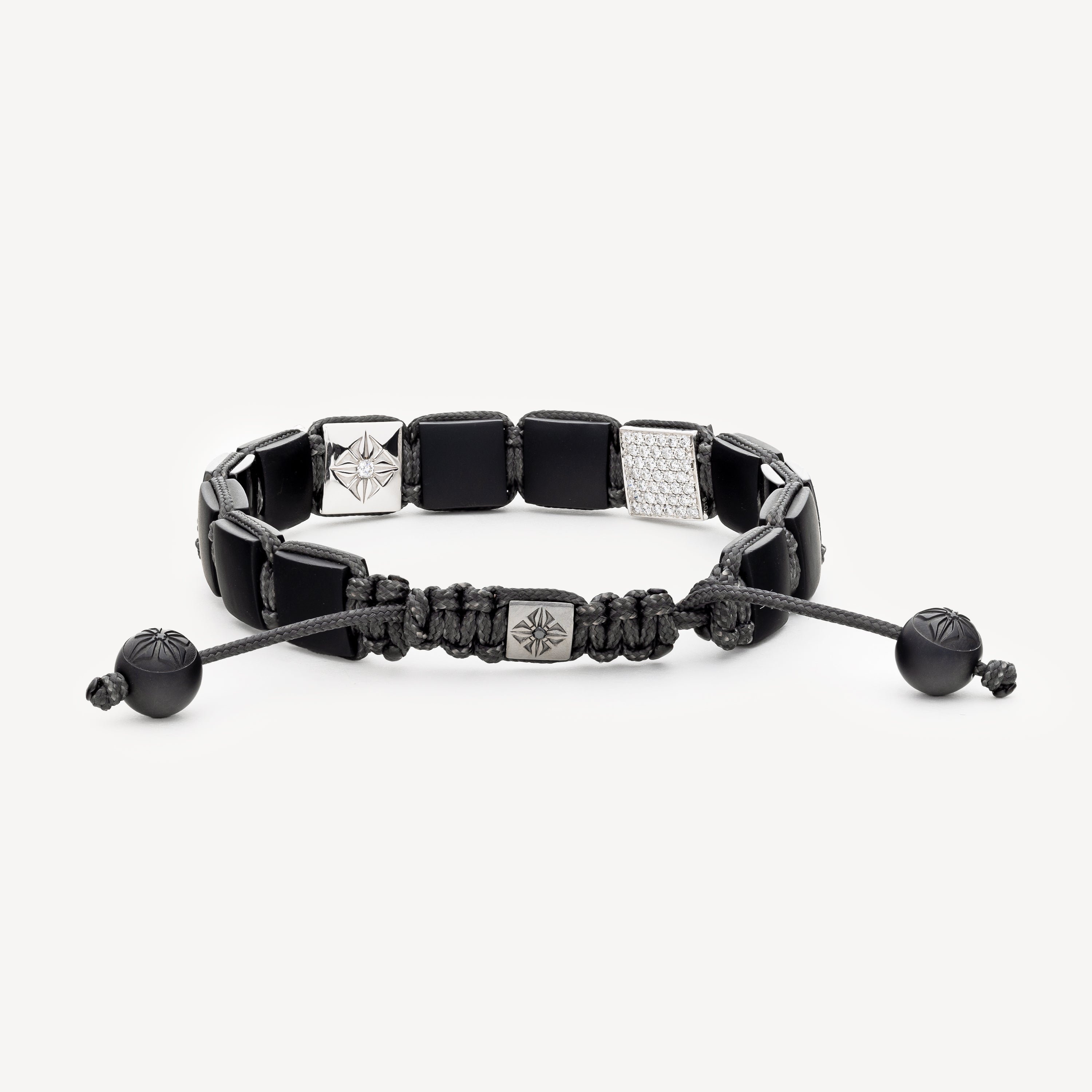 Bracelet mounted on a dark gray cord featuring 14 locks and 2 beads: 2 black jade locks, 9 black ceramic locks, 1 white gold lock set with a black diamond and a white diamond, 1 white gold lock paved with black diamonds on the outside and white diamonds on the inside, 1 black gold lock set with a black diamond and 2 black jade beads.