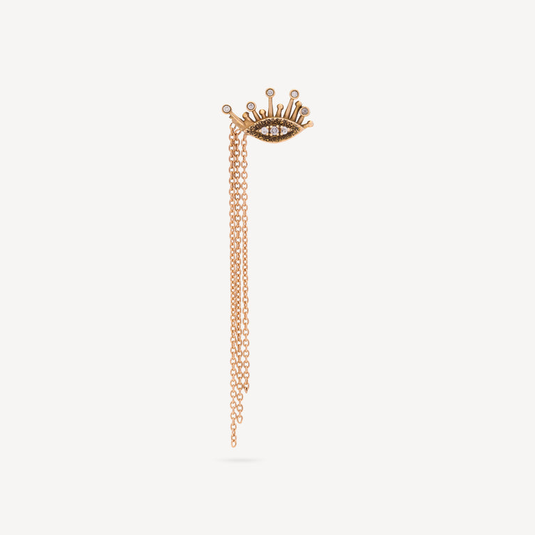 Boucle d’oreille œil en or rose ornée de diamants blancs avec trois chaînes pendantes.