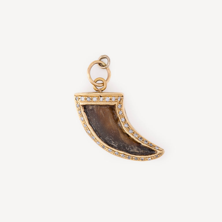 Yellow gold tooth-shaped pendant adorned with a brown center stone surrounded by white diamonds.