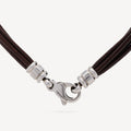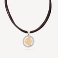 Necklace mounted on a five-thread brown cord featuring a round silver and gold pendant with a fish motif.