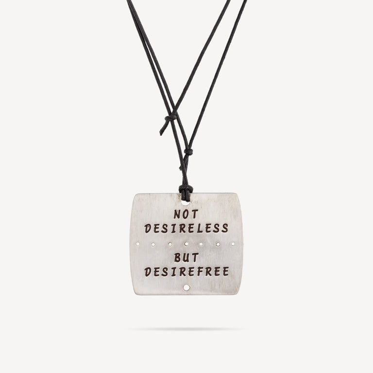 Pendant necklace with engraved Silver plate: "Not desireless but desirefree."