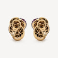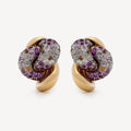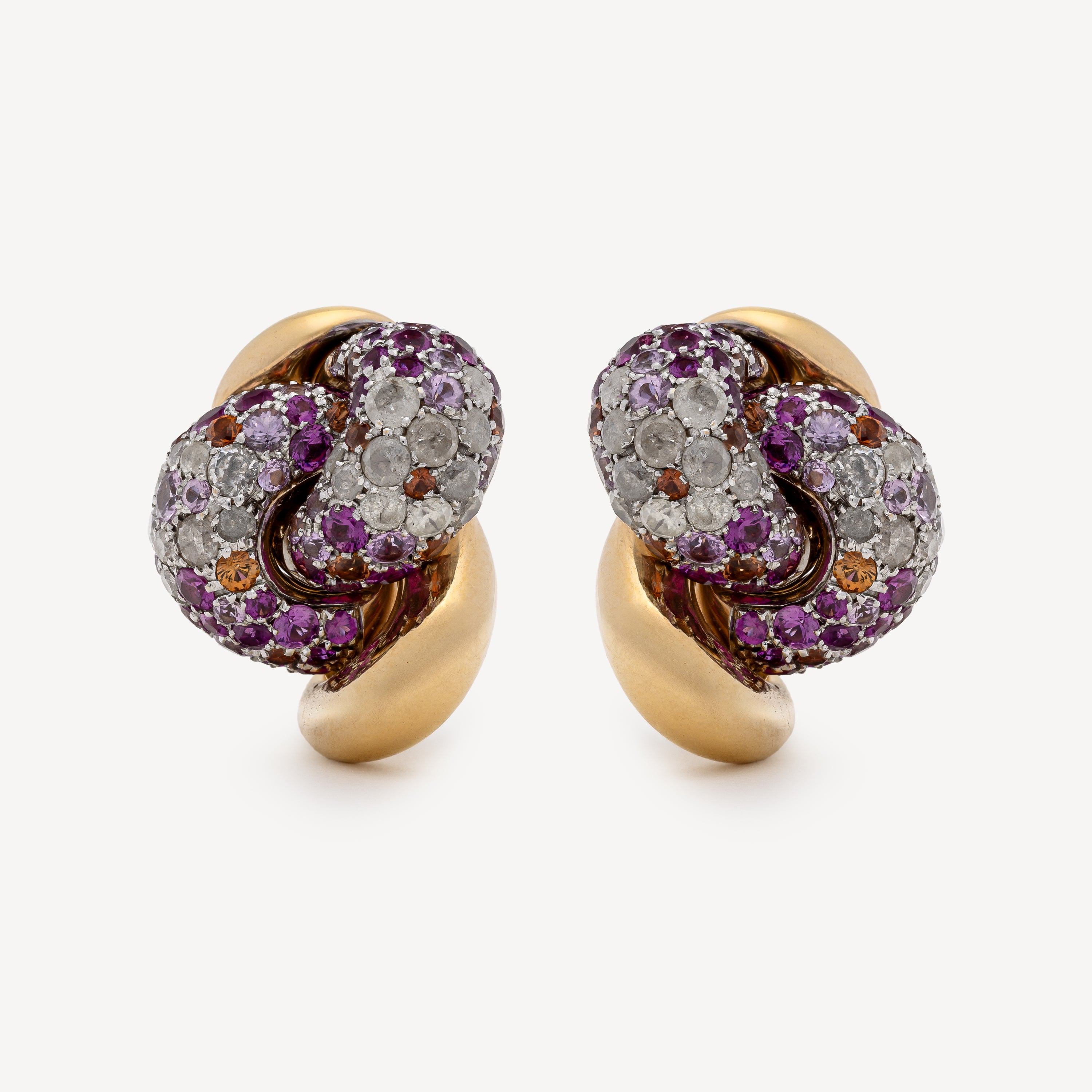 Clip earrings in yellow gold paved with diamonds and pink and orange sapphires.