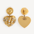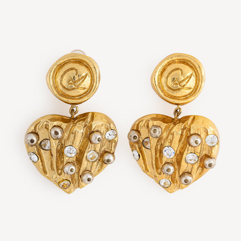 Vintage gold-plated resin clip earrings with dangling hearts adorned with clear crystals and faux pearls.