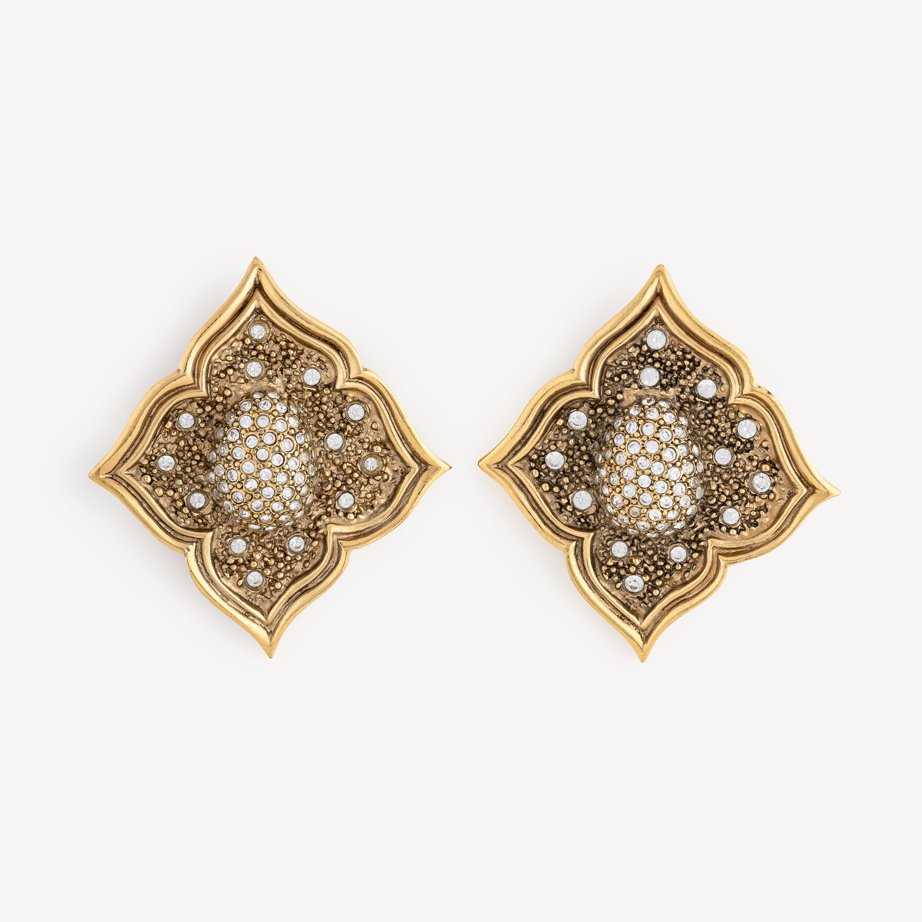 Lozenge flower vintage clip earrings in gold-finish metal, adorned with rhinestones.