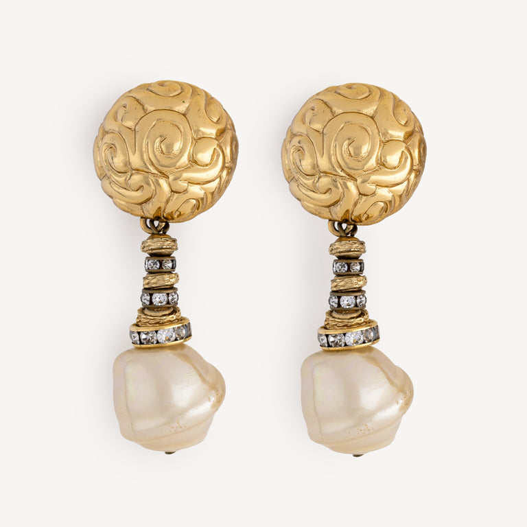 Vintage clip earrings in gold-finish metal with faux pearl drop pendants with crystal-embellished rondelles.