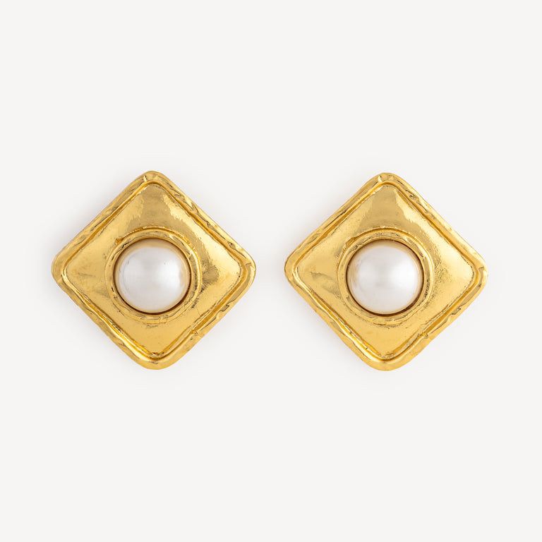 Vintage rhombus clip earrings, in gold-finish metal, adorned with a pearly gripoix.