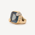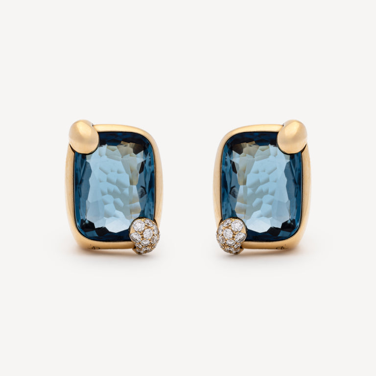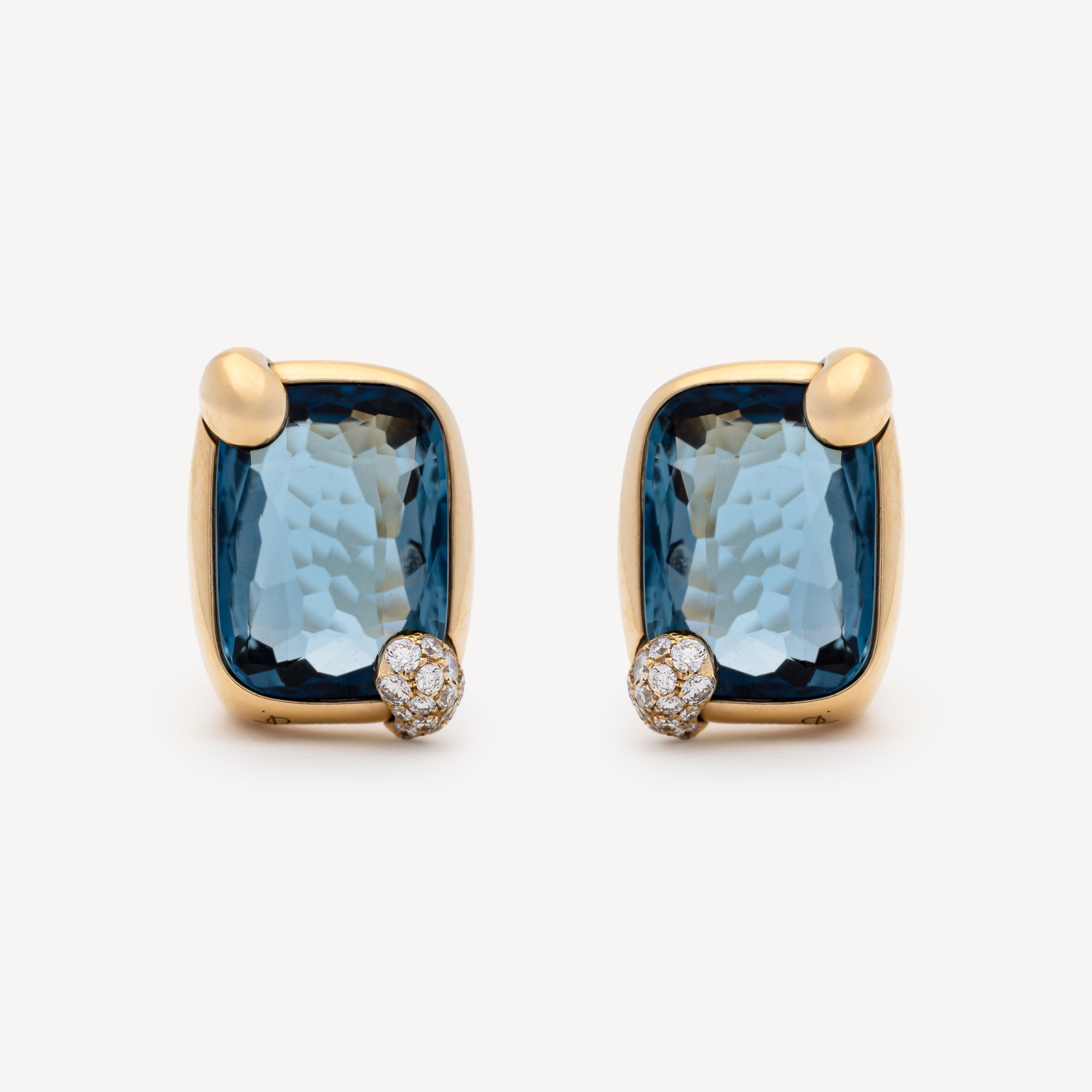 Yellow gold clip earrings adorned with a central London blue topaz and a diamond-paved claw.