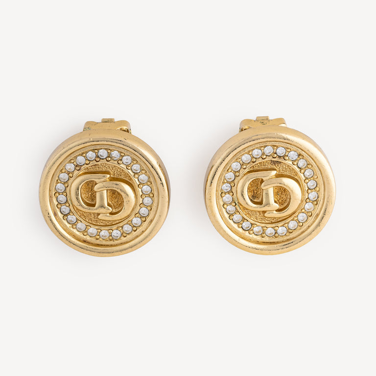 Gold-finish metal clip earrings with Christian Dior logo and silver crystals.