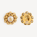 Vintage clip earrings in gold-finish metal with central faux pearl and Chanel logo.