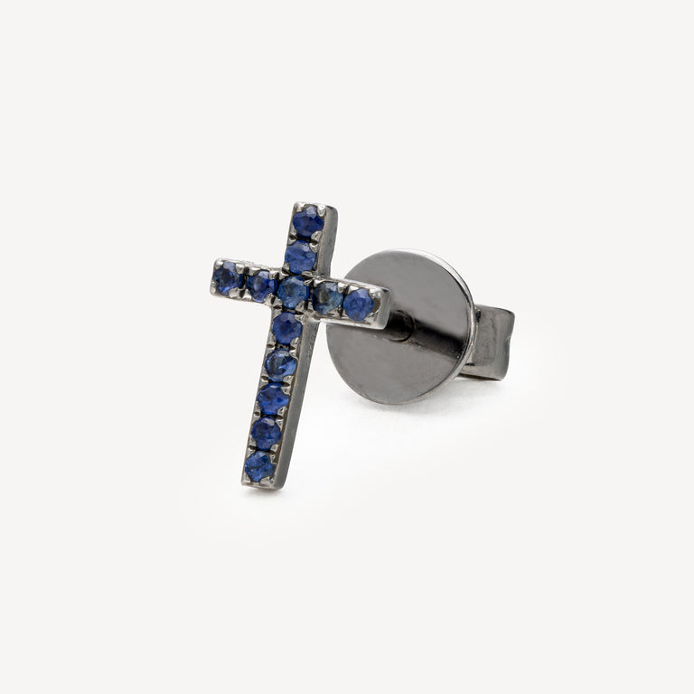 Stud cross earrings in black gold with sapphires.