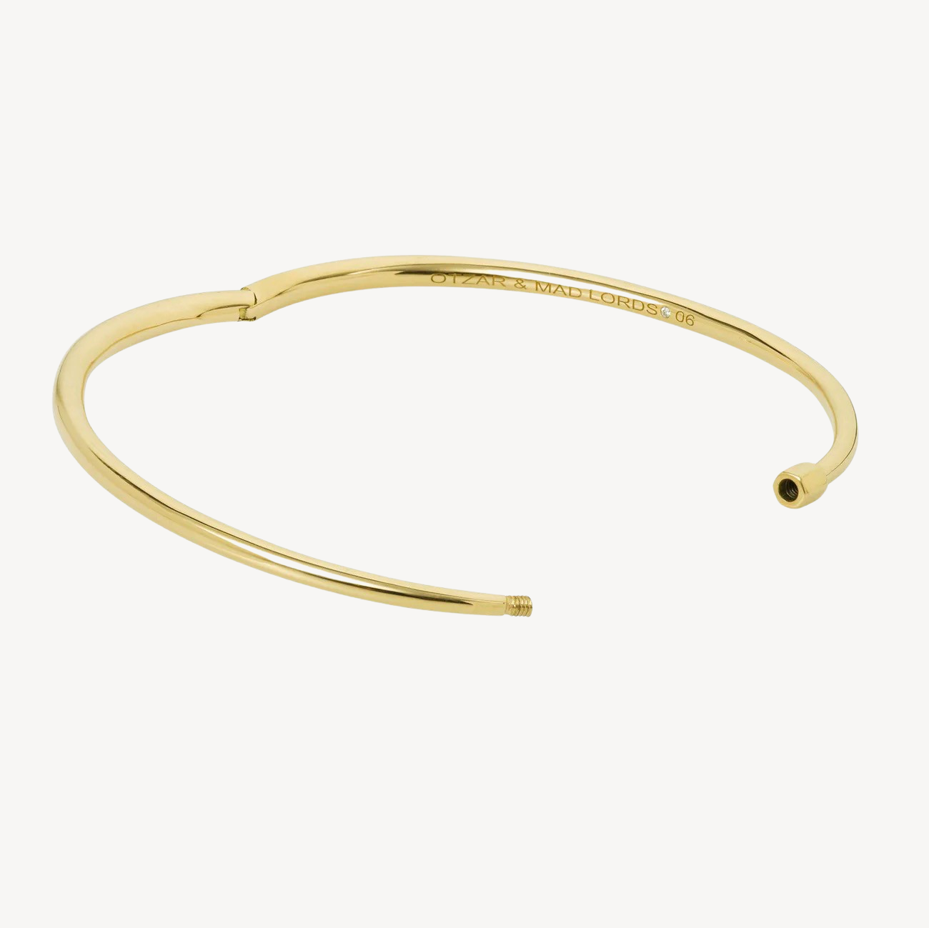 MINE is a ring cut from over an ounce of pure gold (31 grams). A witness to the passage of time, it is as asymmetrical as a contemporary poem and as timeless as the wearer's message. This jewel is screwed to the wrist like a seal of love. It advocates a contemporary interpretation of union that respects the choices of the individuals who adhere to it. The side nut gives its line an indispensable asperity for this jewel that reflects the alliance between two beings. The perfection of its oval shape is the result of two branches that extend into each other. An invisible hinge testifies to the presence of two worlds, each with its own shadows.