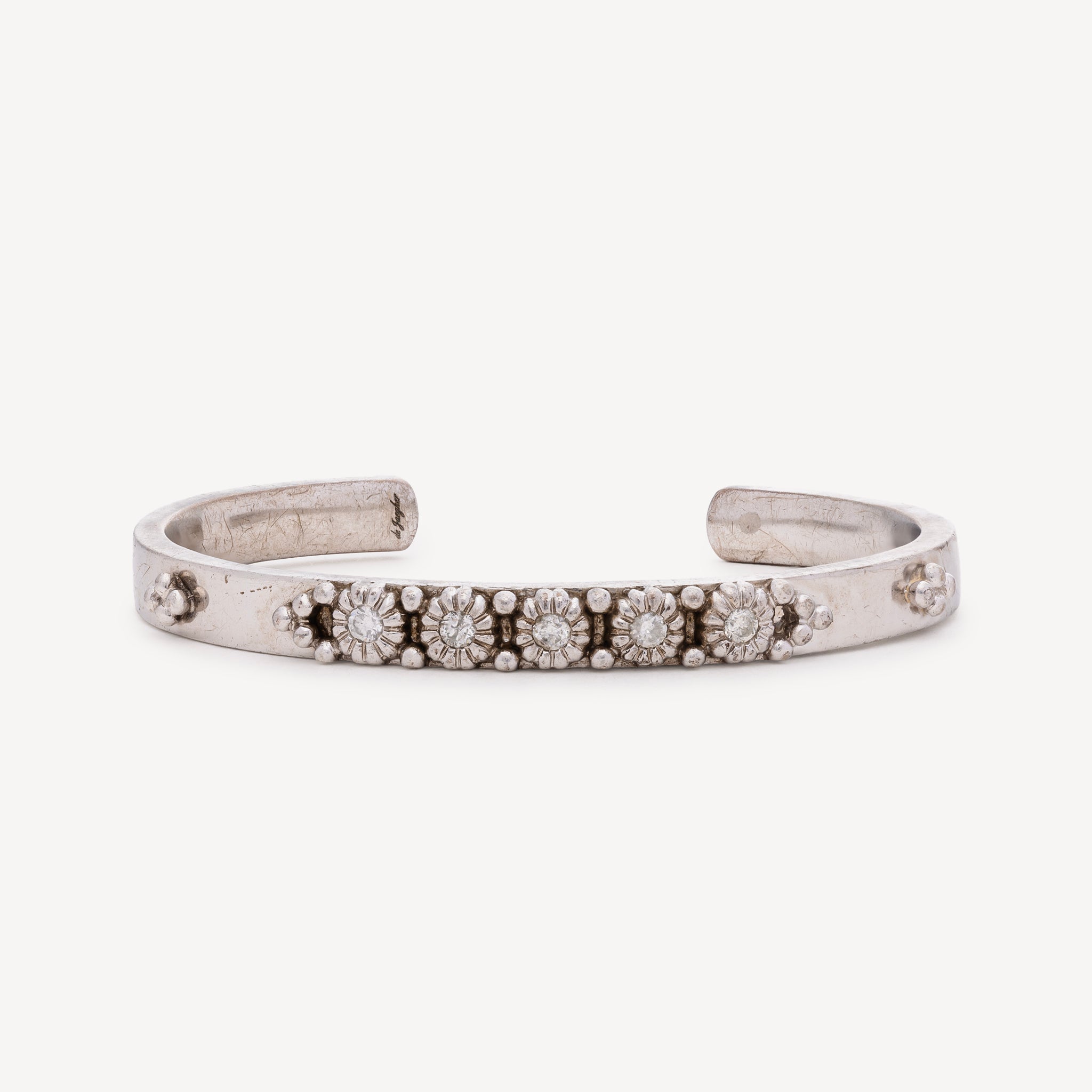 Silver bangle bracelet adorned with flower motifs and diamonds.