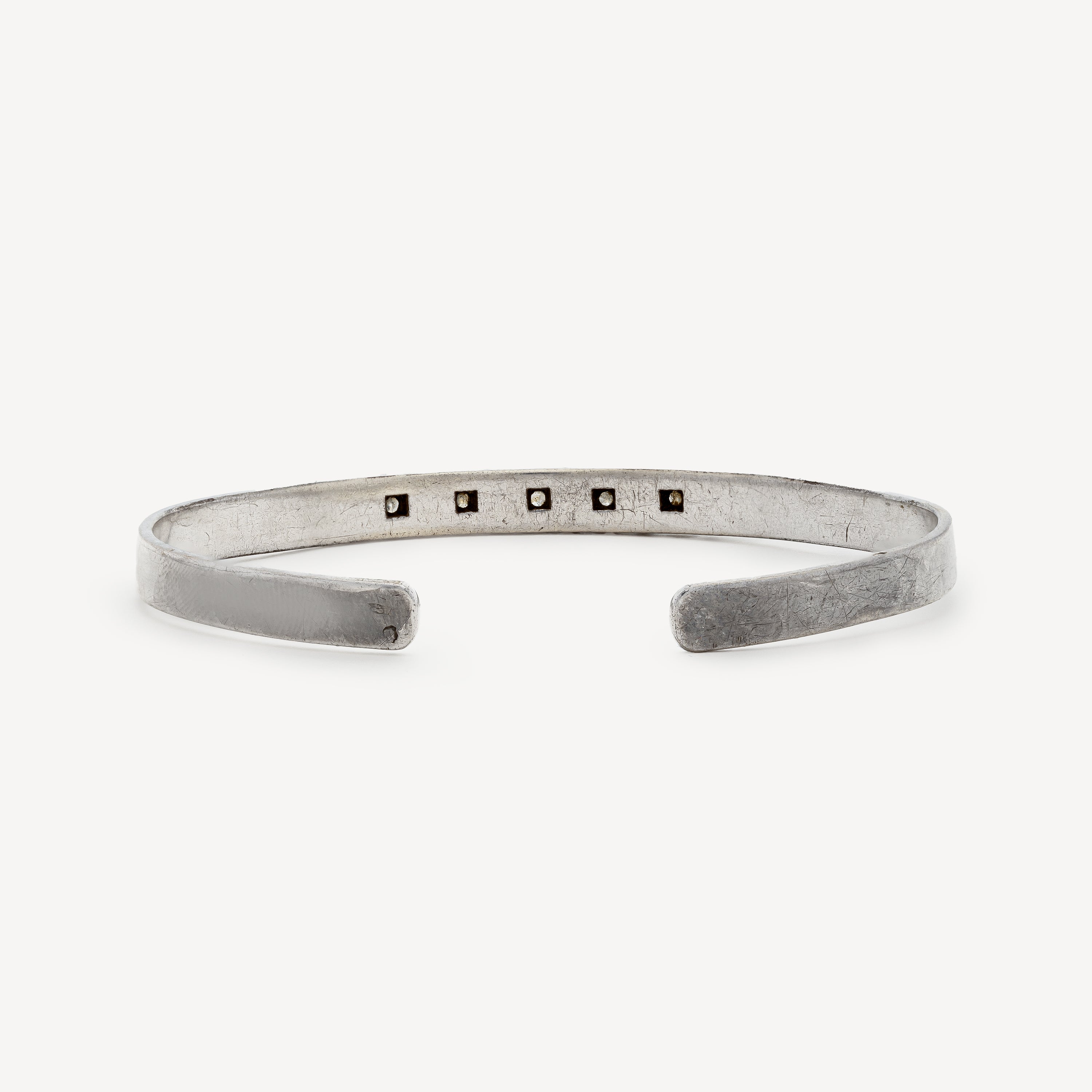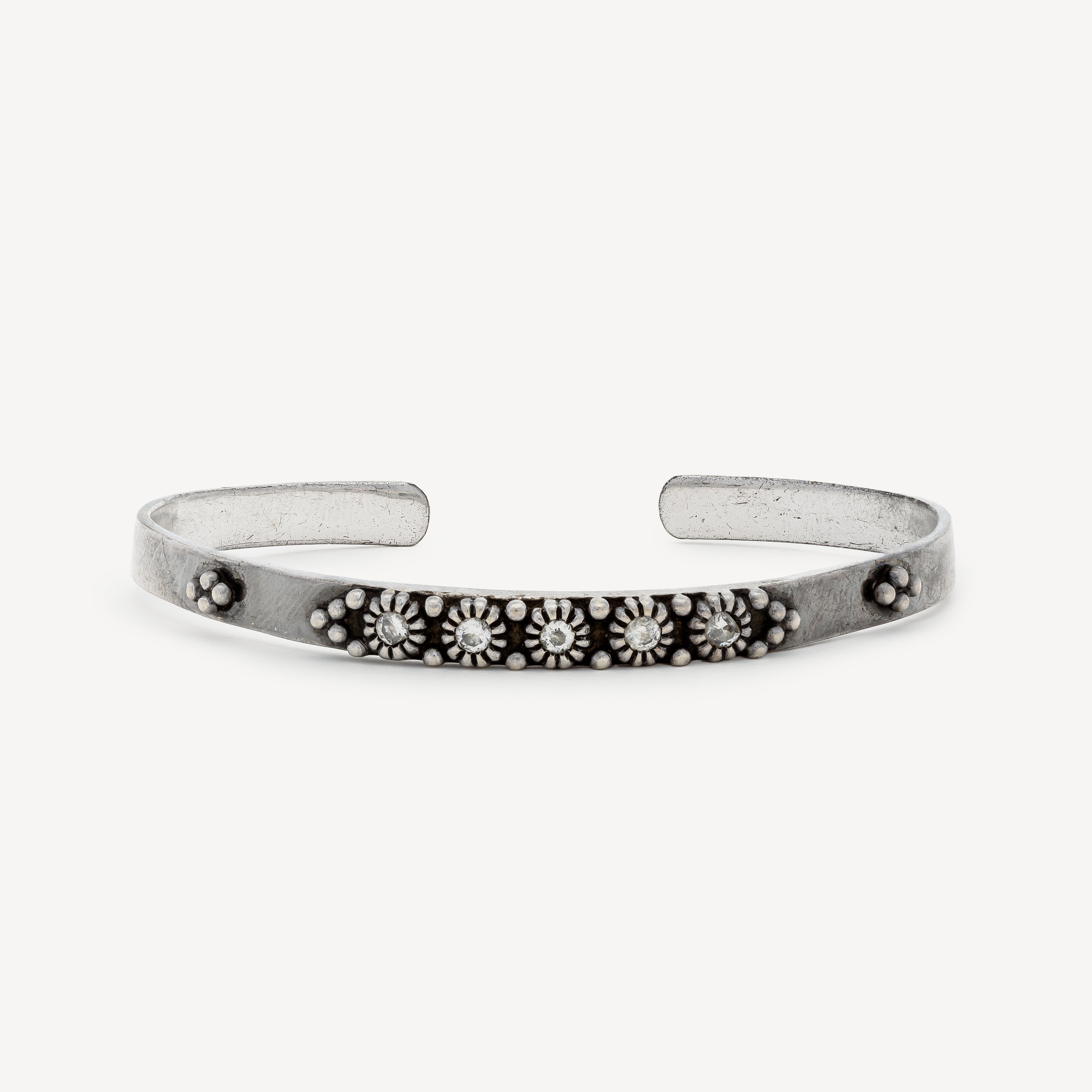This Silver bezel is enhanced by flower motifs with white diamonds in a closed setting.