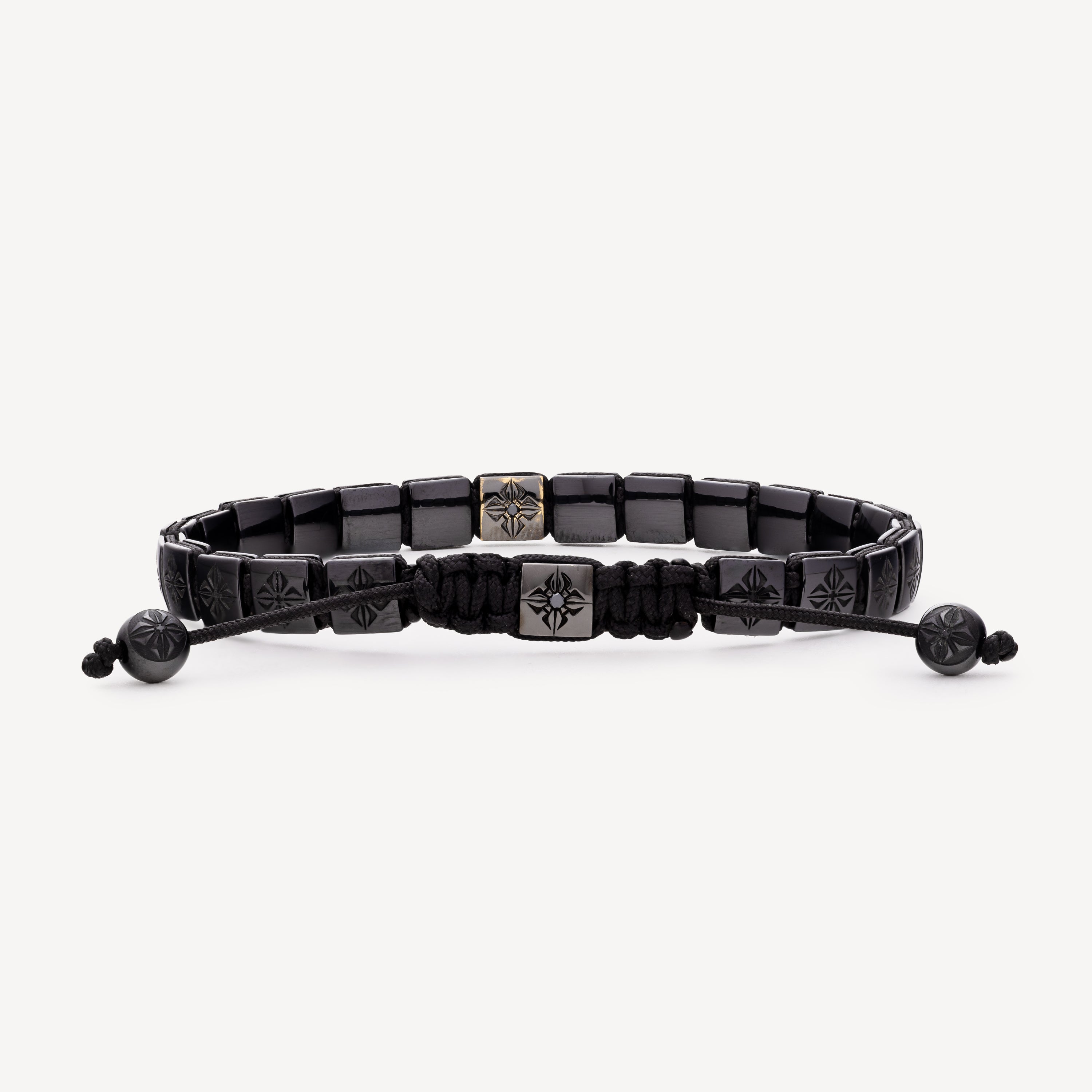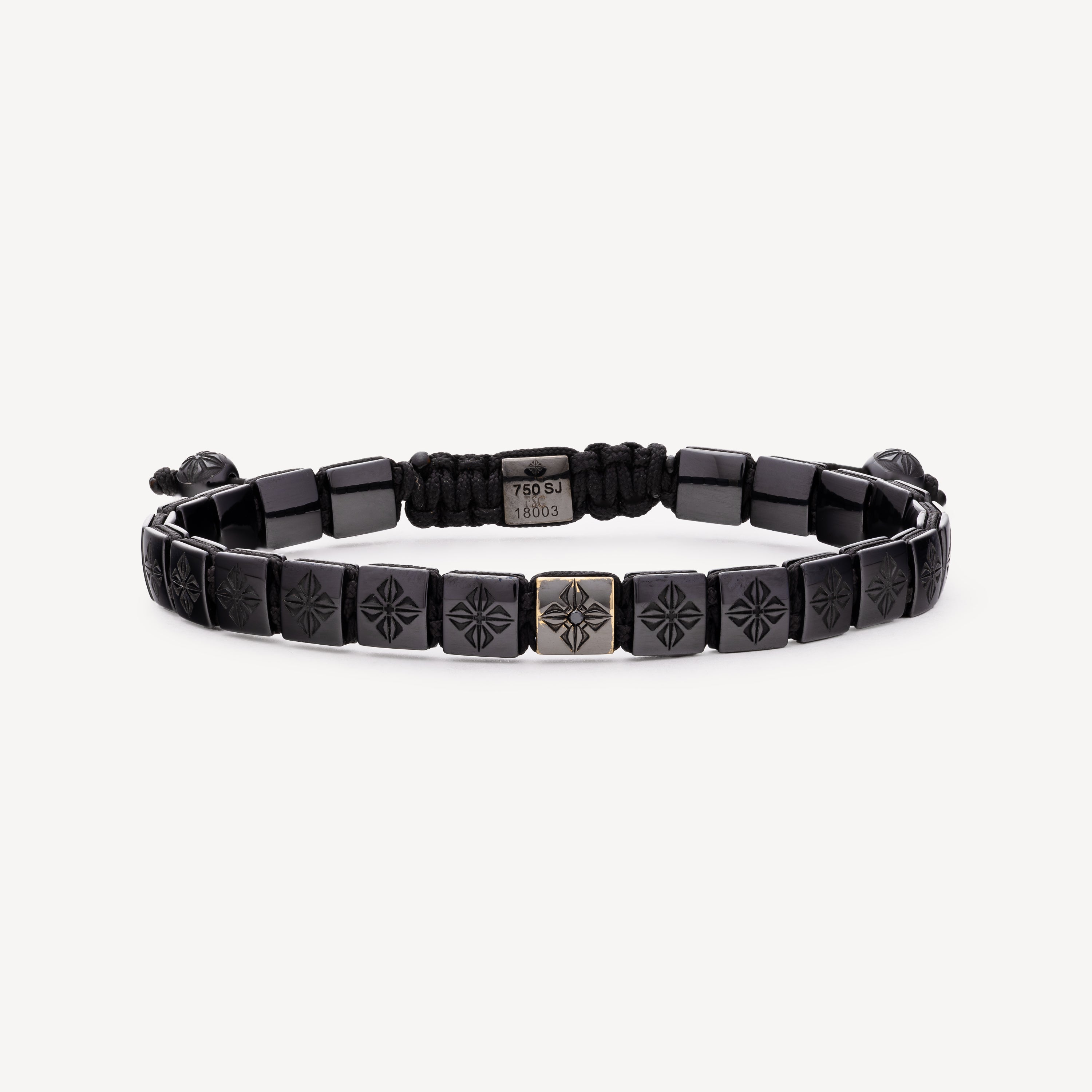 Bracelet monté sur un cordon noir composé de : 2 locks en or noir ornés de diamants noirs, 2 beads en céramique noire, et 22 locks en céramique noire.