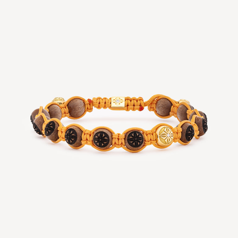 Bracelet mounted on an orange braided cord composed of 16 beads and a lock: 13 ebony beads, 3 yellow gold beads set with 2 diamonds, 1 yellow lock set with a diamond.