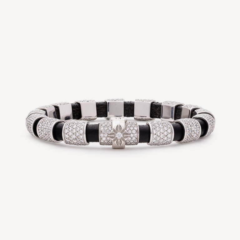 Bracelet mounted on a thick leather cord and composed of 16 white gold beads paved with white diamonds.