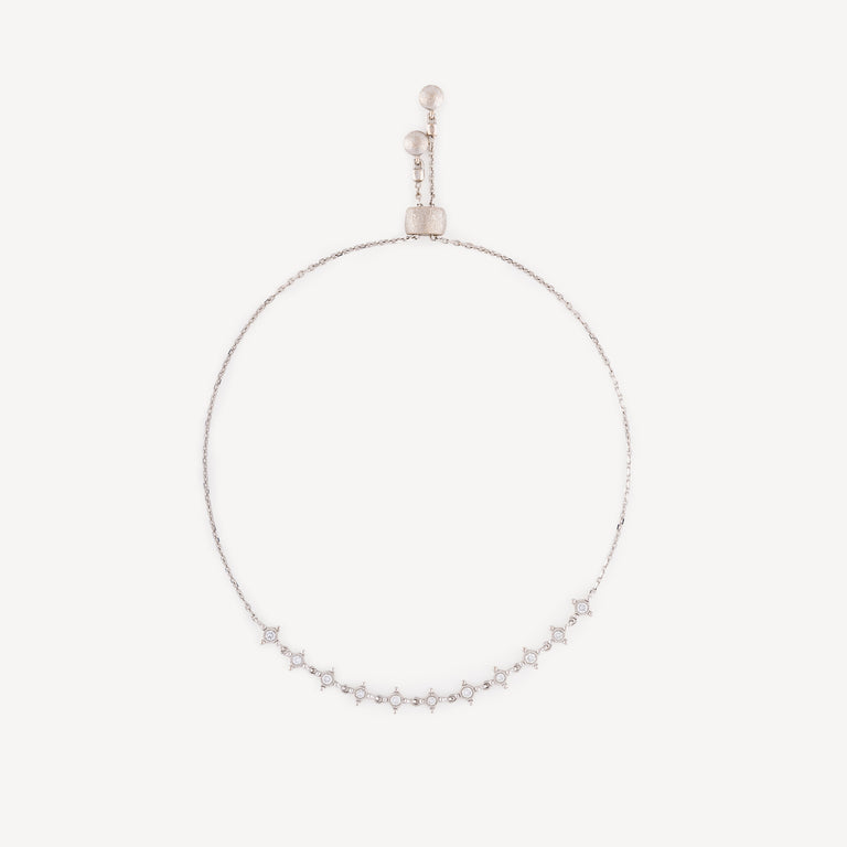 White gold chain bracelet embellished with eleven diamonds. Length adjustable with sliding bead.