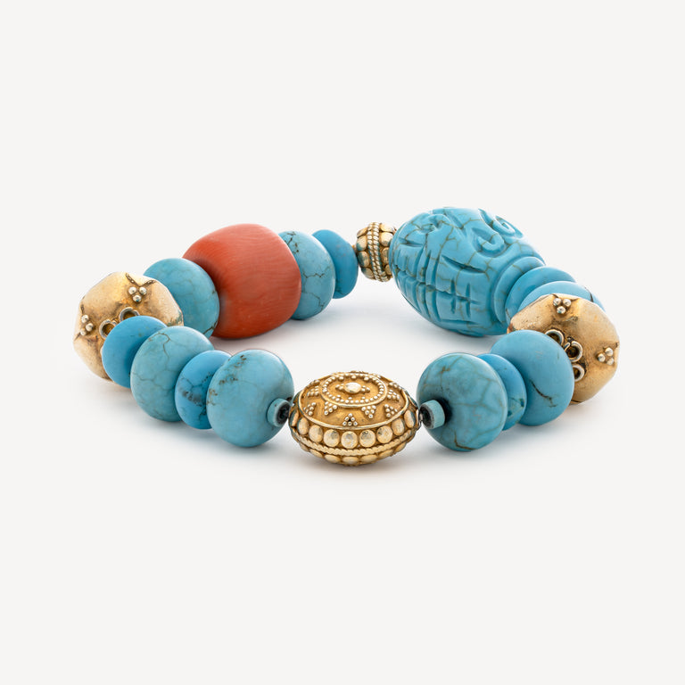 Turquoise and coral bead bracelet with vermeil spacers, mounted on elastic.