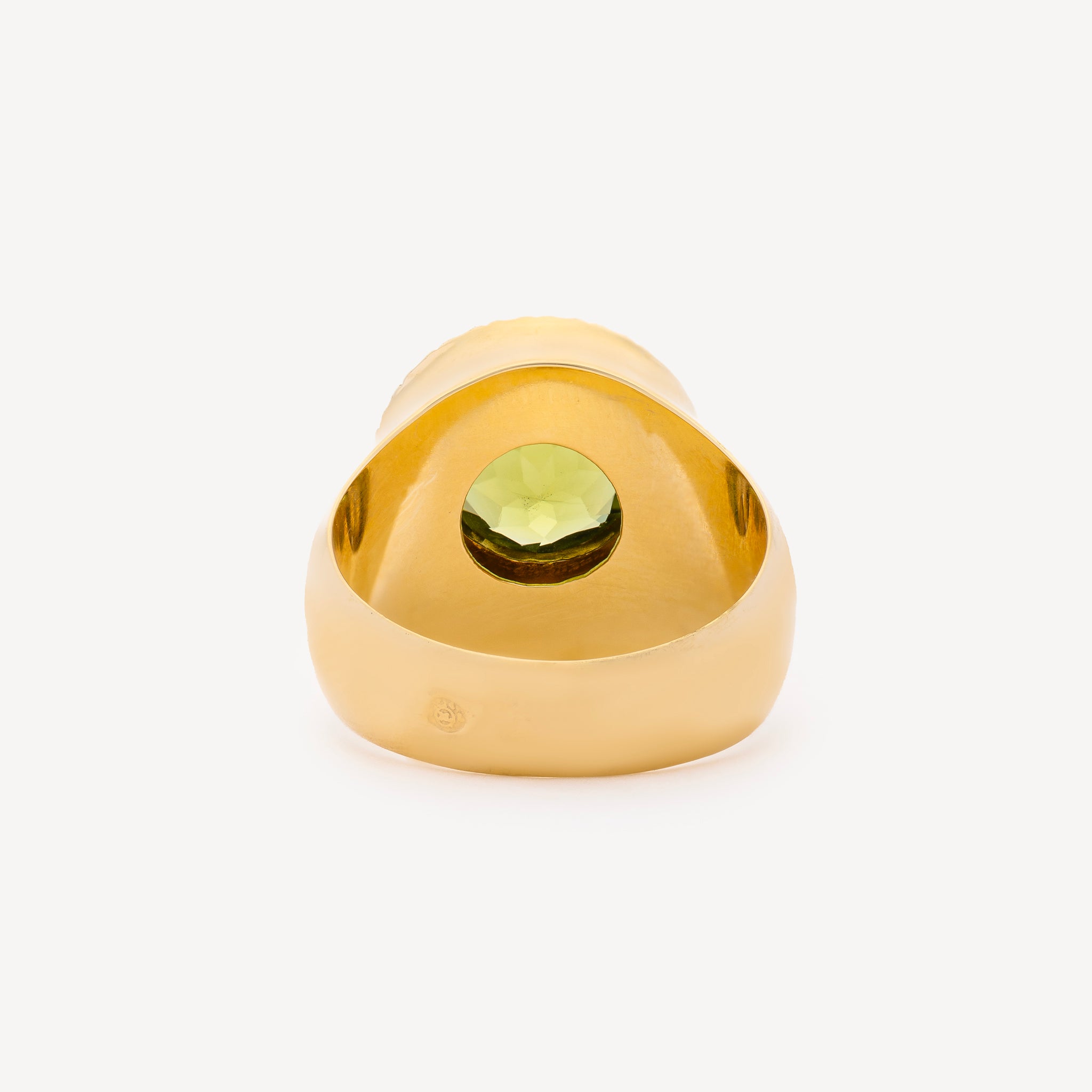 The central peridot, a luminous, intense green, instantly captures the eye with its dazzling presence. It is sublimated by a delicate halo of diamonds that diffuse a subtle brilliance, combining power and refinement. A stone of renewal, peridot attracts joy and vitality, while diamonds embody purity, clarity and inner strength.