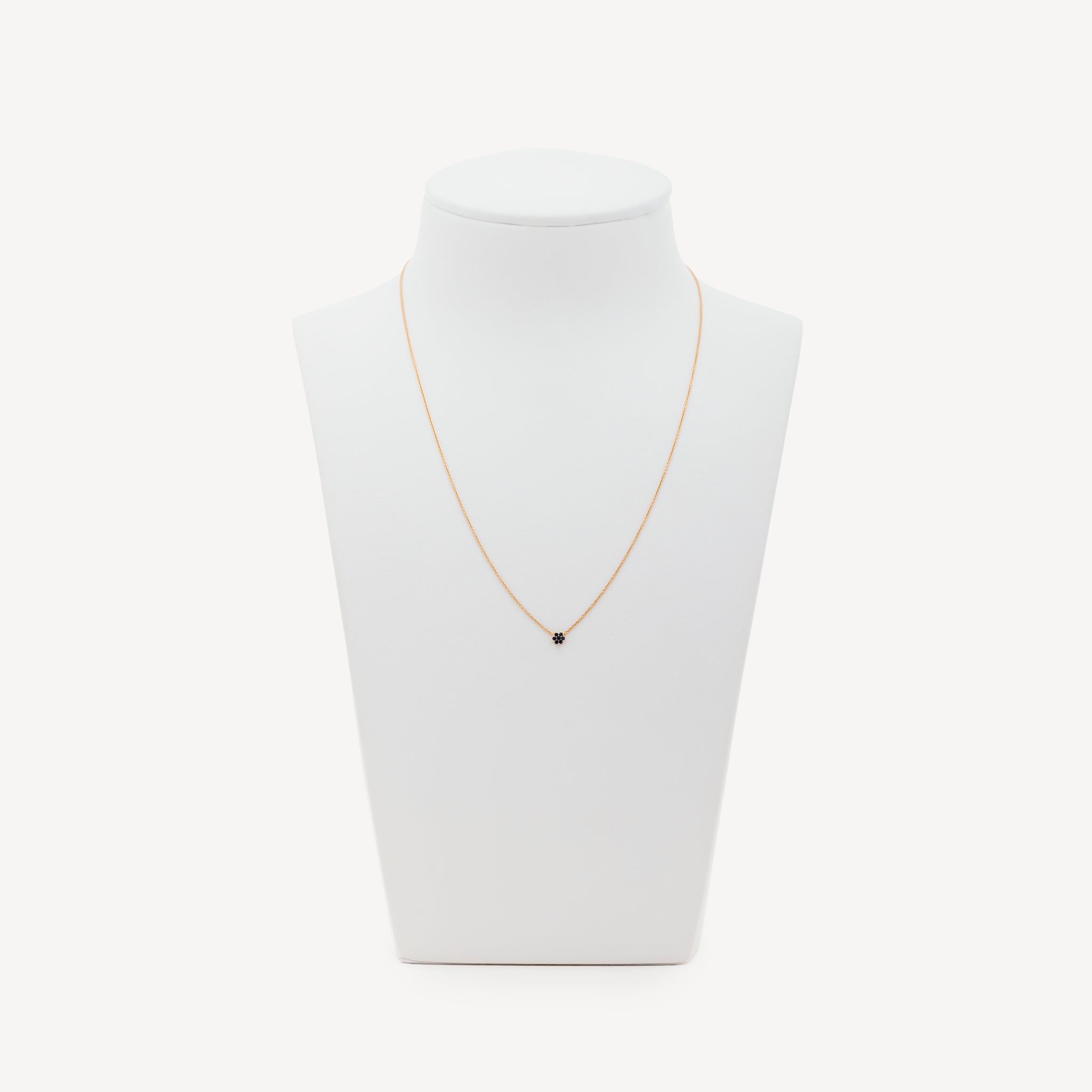 Collier en or rose avec petit motif fleur serti de sept saphirs bleus.