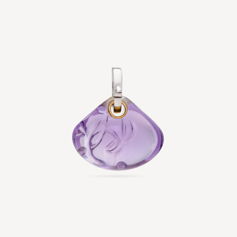 Purple amethyst pendant engraved with a tree of life with white gold clasp.