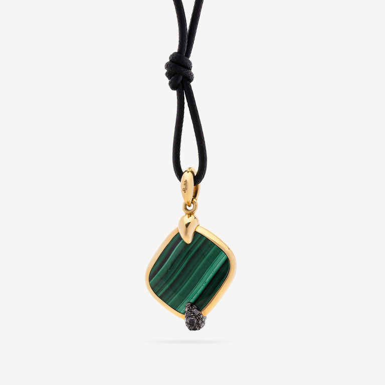 Magnificent yellow gold medium pendant necklace adorned with a malachite and a diamond-paved claw.