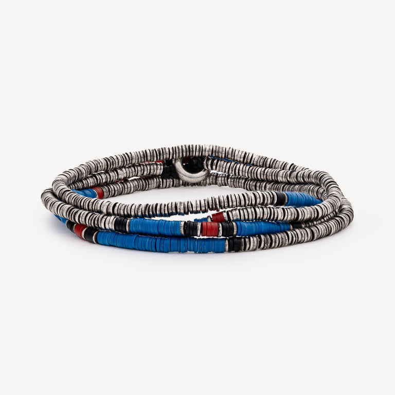 Bracelet mounted on a black cord made of predominantly blue African beads andSilver discs. Can also be worn as a necklace.