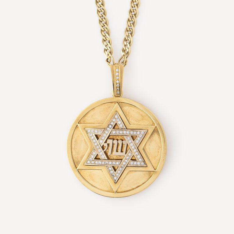 Yellow gold necklace with gold Star of David pendant and white diamonds.