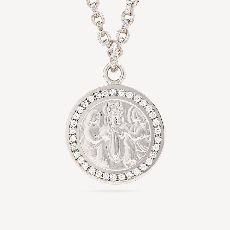 White gold chain with white gold angel medallion adorned with a cross on the reverse and white diamonds.