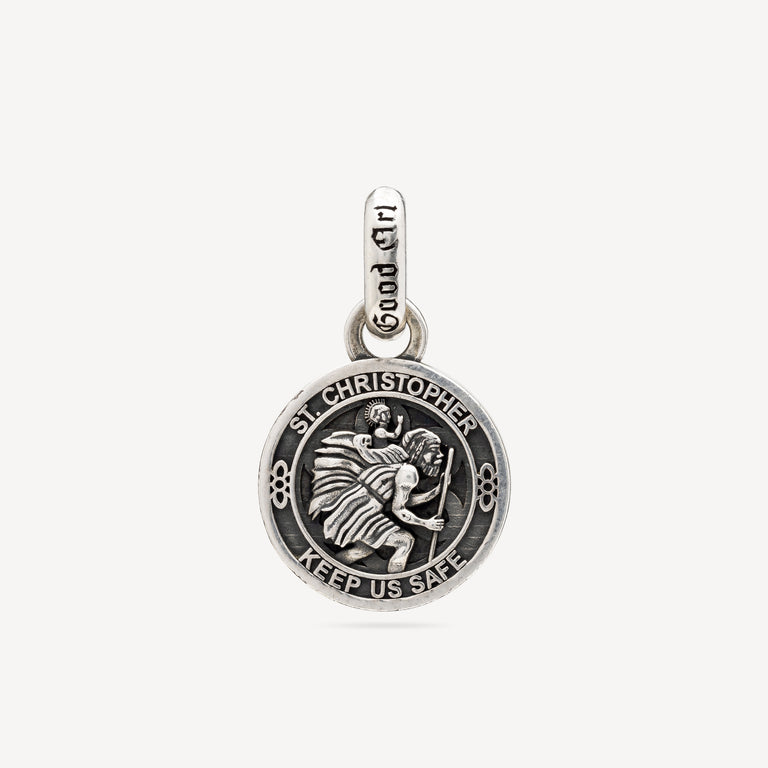 Silver pendant with Saint-Christophe on front and lightning bolt on back.
