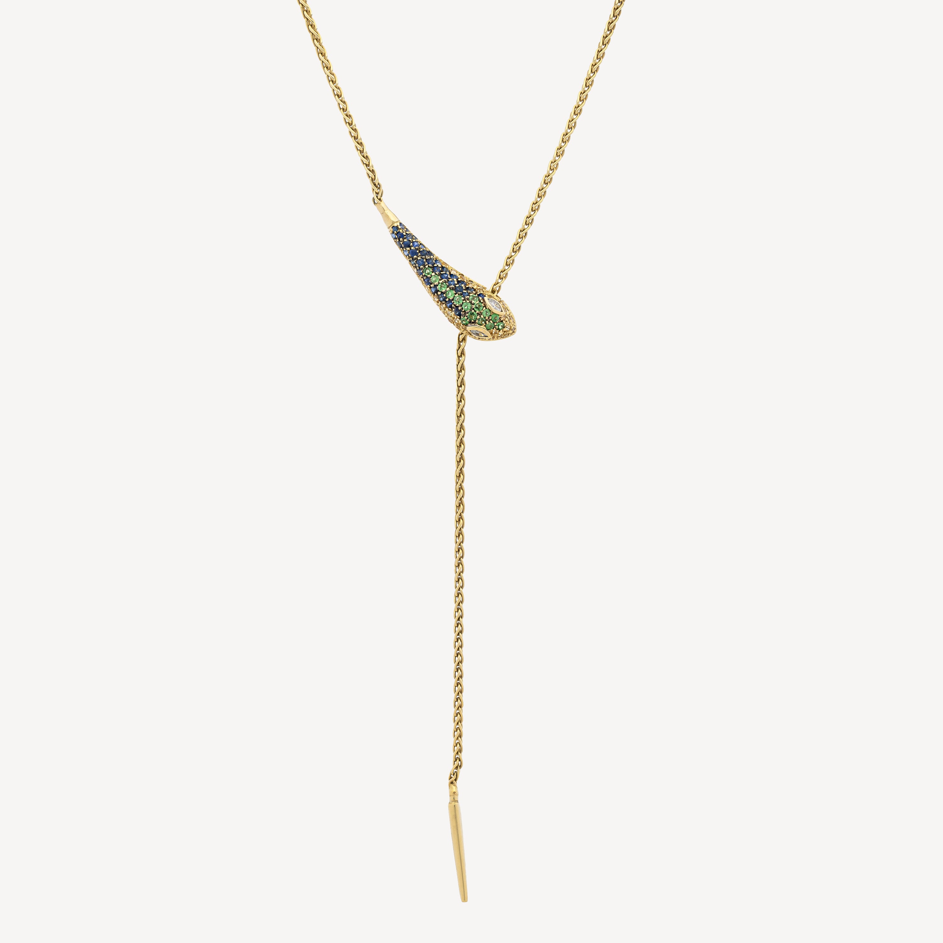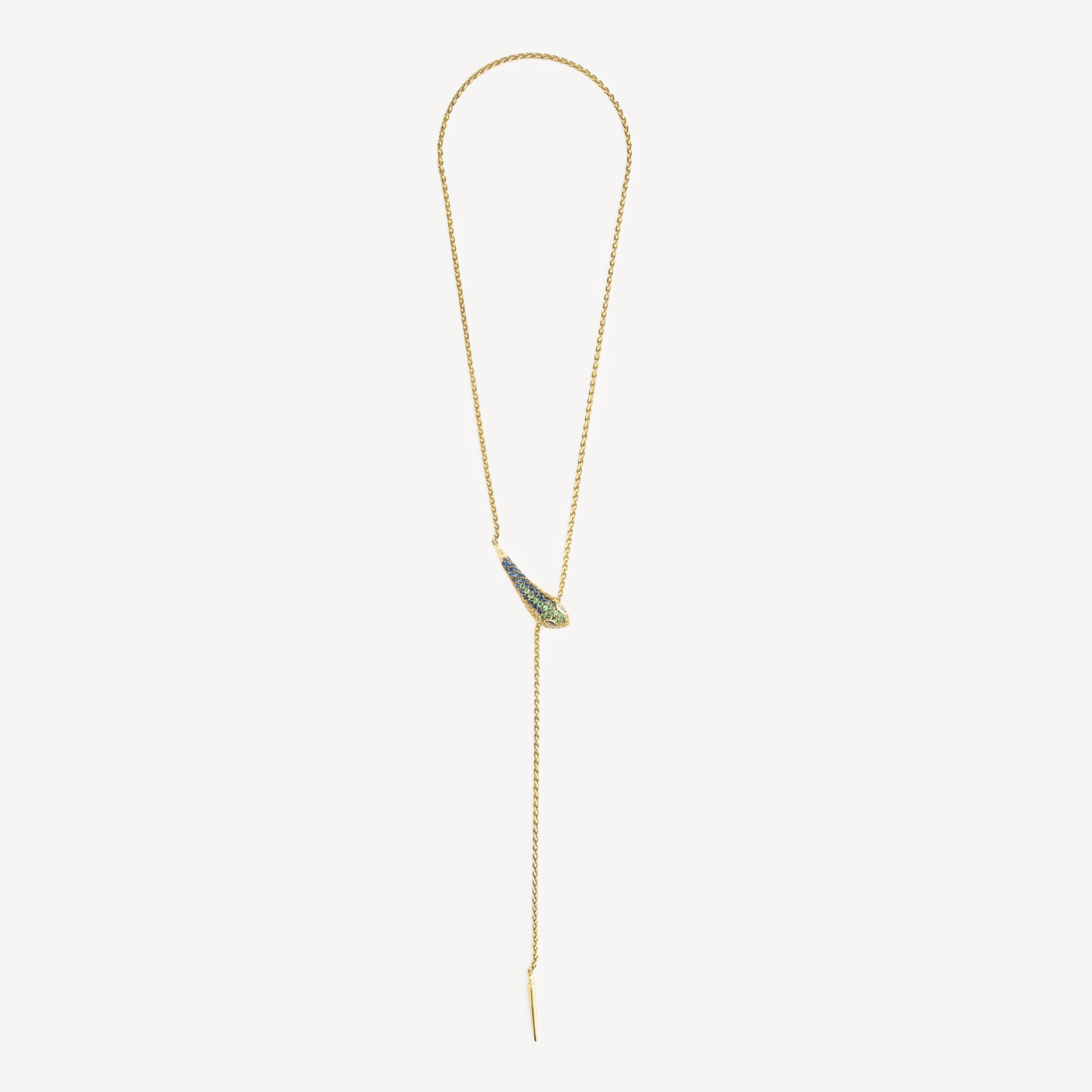 Adjustable yellow gold necklace with snake clasp paved with diamonds and blue and green sapphires.